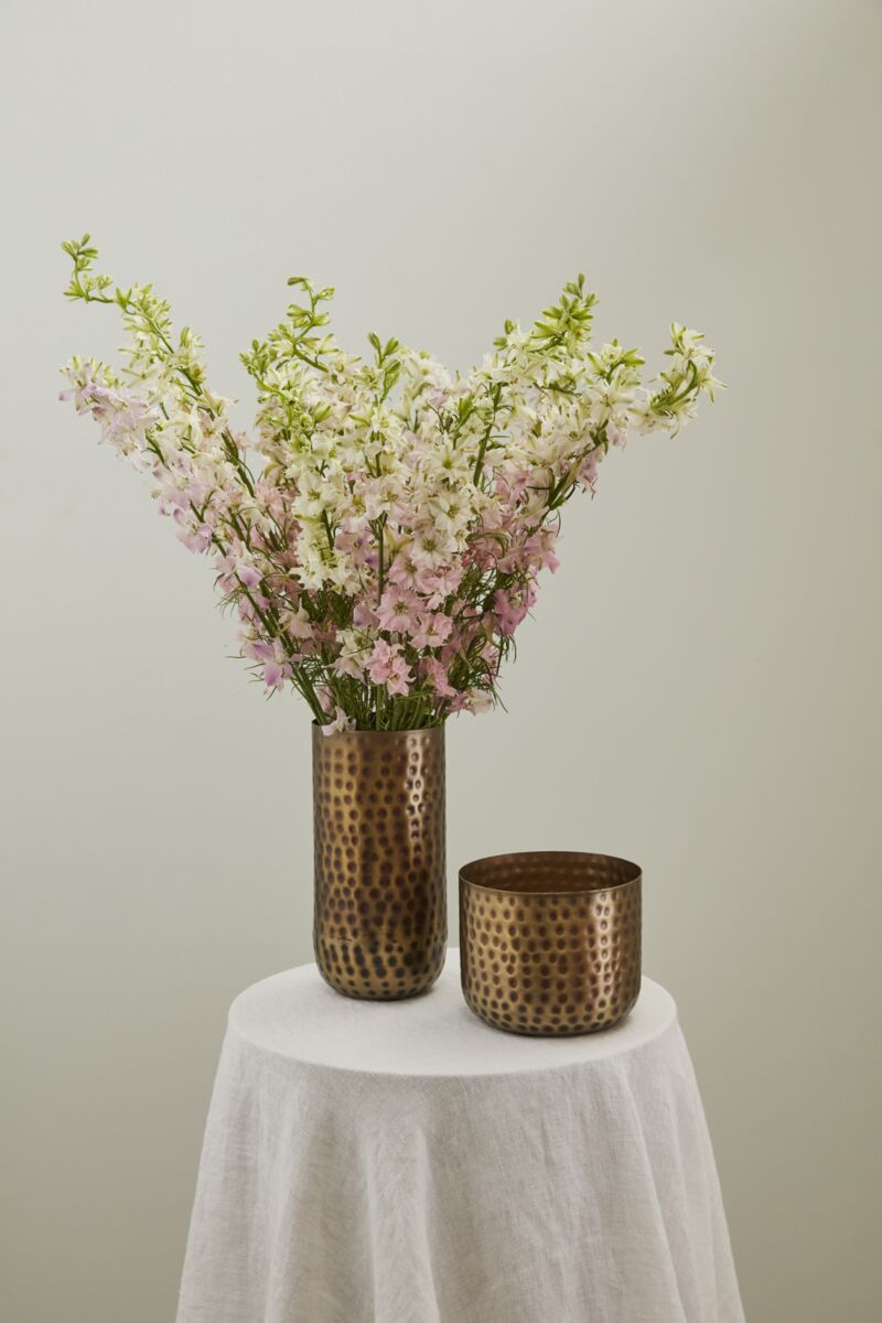 Bring old-world charm & a refined sensibility to floral design & weddings or events with the Alchemy Vase, perfectly sized & lightweight for transport. The Pot is perfect for a low arrangement or small plant. Featuring a simple silhouette, antiqued gold or bronze finish, & a dimpled design with subtle texture, this cylinder vase or pot elevates everyday decor & offers a sleek, understated look to formal events.