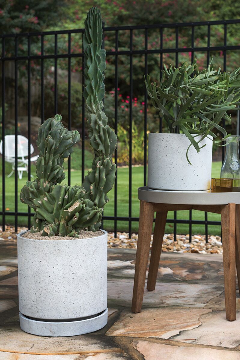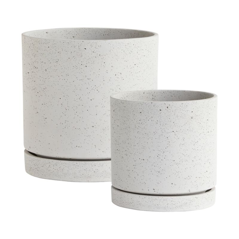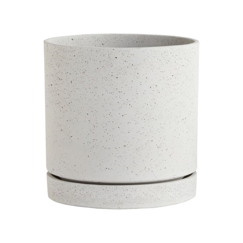 With a modern terrazzo finish, the Callahan Pot is designed for outdoor use. It features a saucer and a drainage hole, and is handmade from cement for a sleek and modern look.