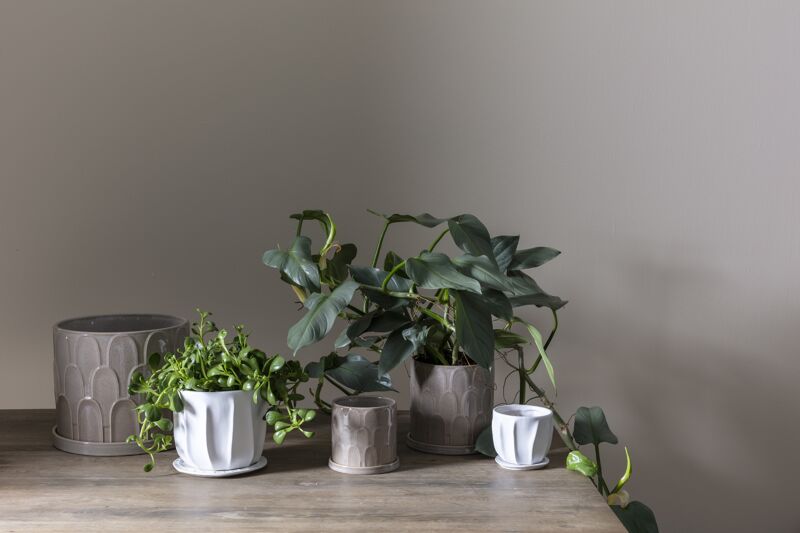 The Draken Pot features a smooth white finish with raised grooves to add organic style to a simple silhouette. A drainage hole and simple saucer make it an everyday staple with an extra dose of style.
