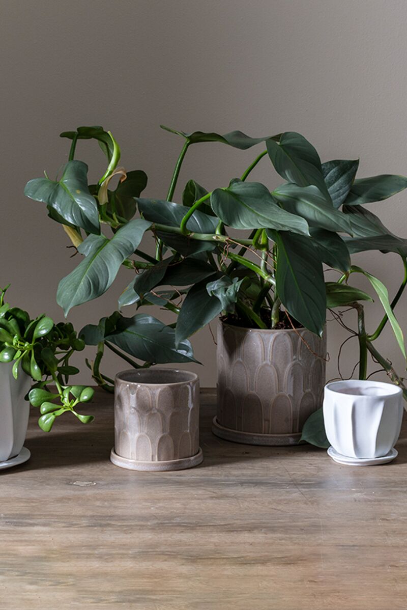 The beautiful sculptural relief arched pattern and grey finish of the Duncan Pot offer understated style with a unique reactive glaze finish.