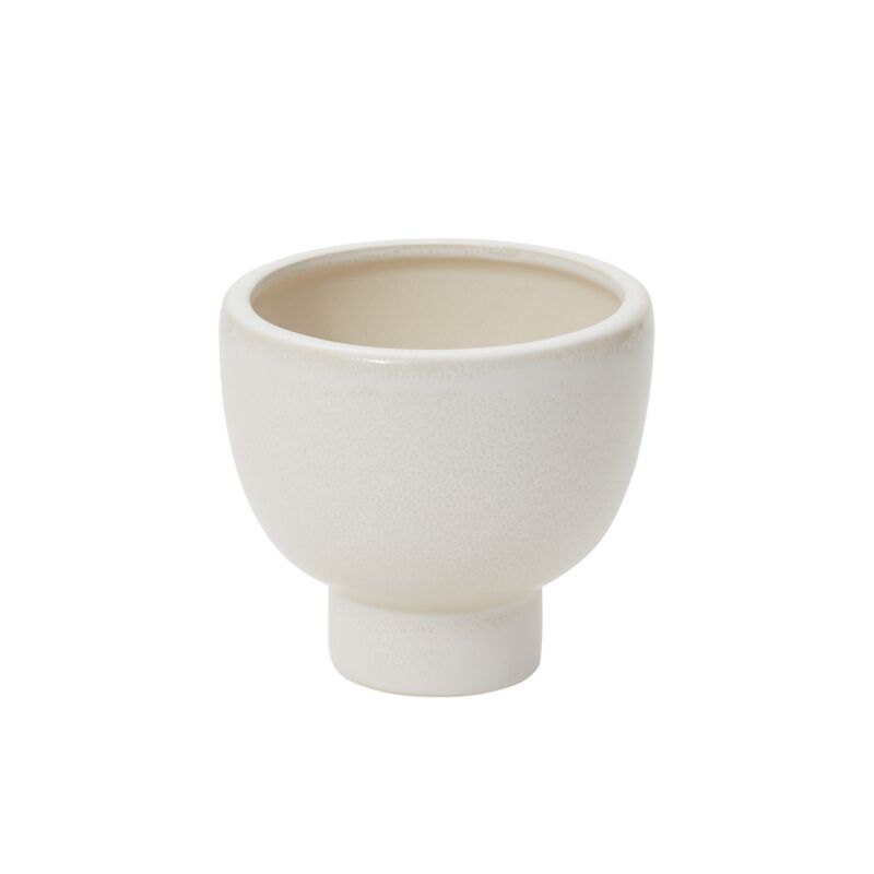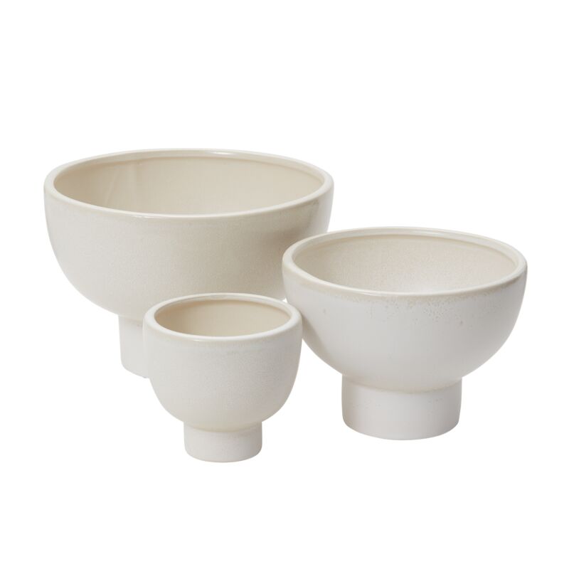 The modern ceramic Elijah Compote is the versatile piece you’ve been looking for to complement home or event décor. Available in 3 sizes & created with sustainable floral design in mind, this piece features an open foot for long stems, holds lots of water, & accommodates various floral mechanics. Featuring a glossy, off-white reactive glaze with a bit of texture, this warm toned neutral vessel offers an easy, elevated look for sweeping floral designs or the simplest potted plant.