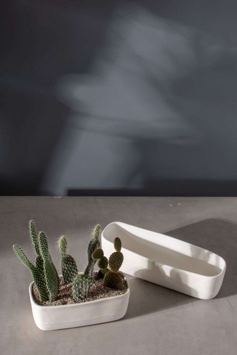 The Evva Trough is simplicity at its most stunning. Made from high-white stoneware clay, this 14-inch long water-tight pot is hand painted & fired 3 times to give it a slight texturization. It's perfect for succulents or an arrangement of plants.