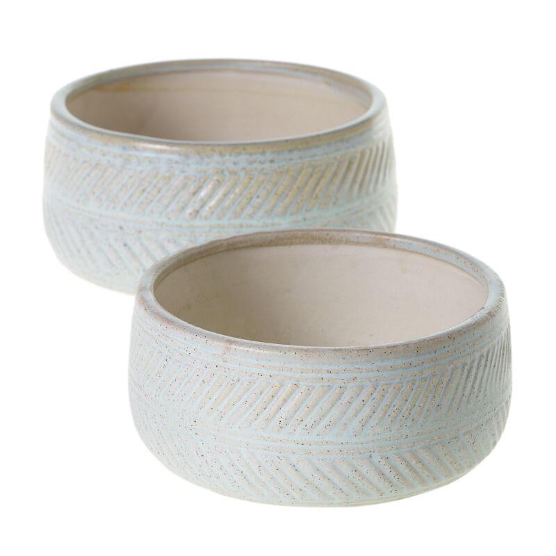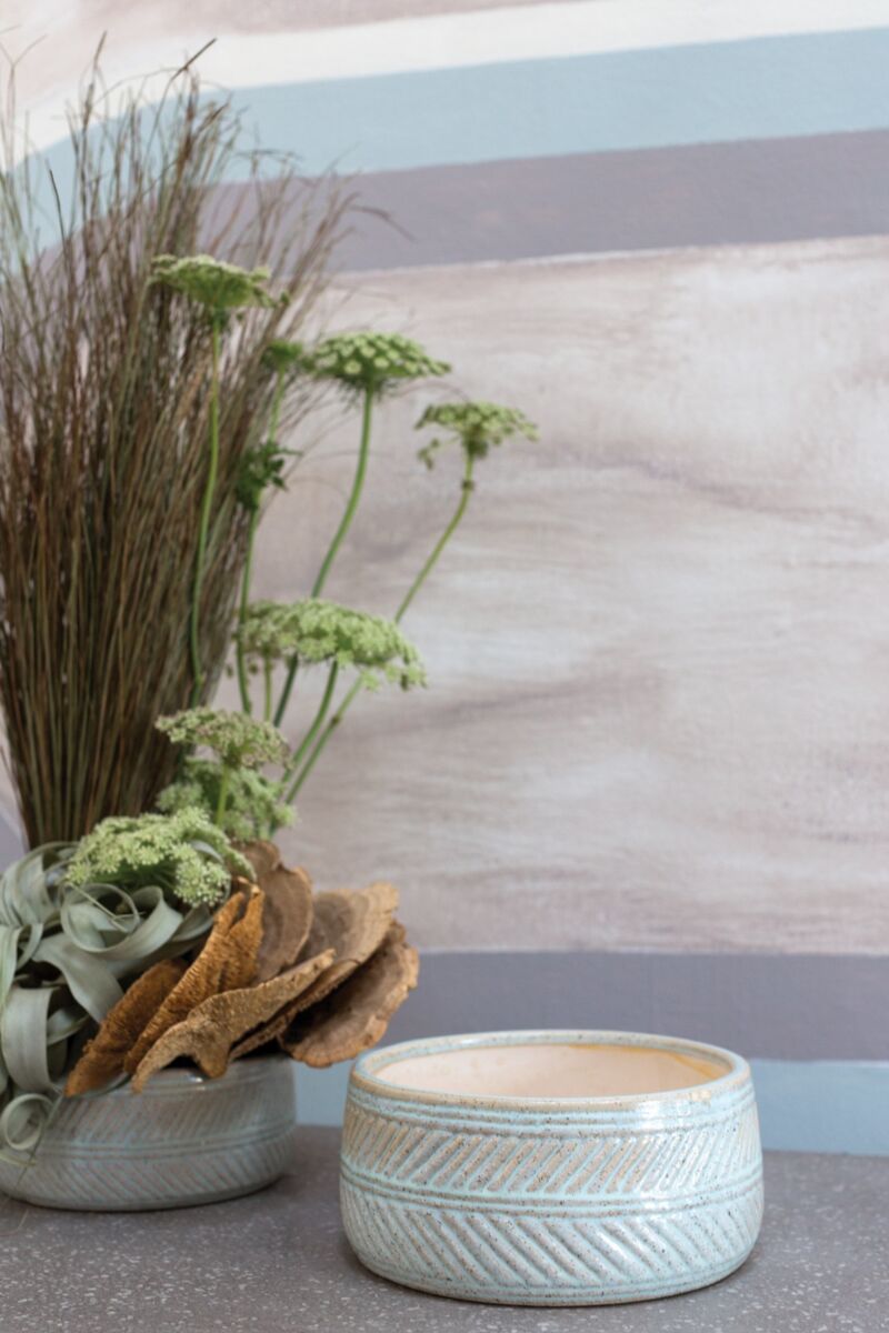 A modern ceramic bowl in light blue patterned textured finish, the Fina Bowl is a work of art alone or filled with flowers.