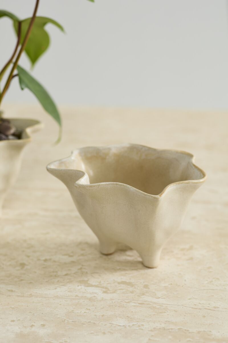 Give plants an earthy, nature-inspired home in the Glaslow Planter, a footed ceramic style with a warm neutral reactive glaze. An irregular opening shape and dimensional surface makes the Glasgow a unique and artful piece to add to a tabletop plant collection.