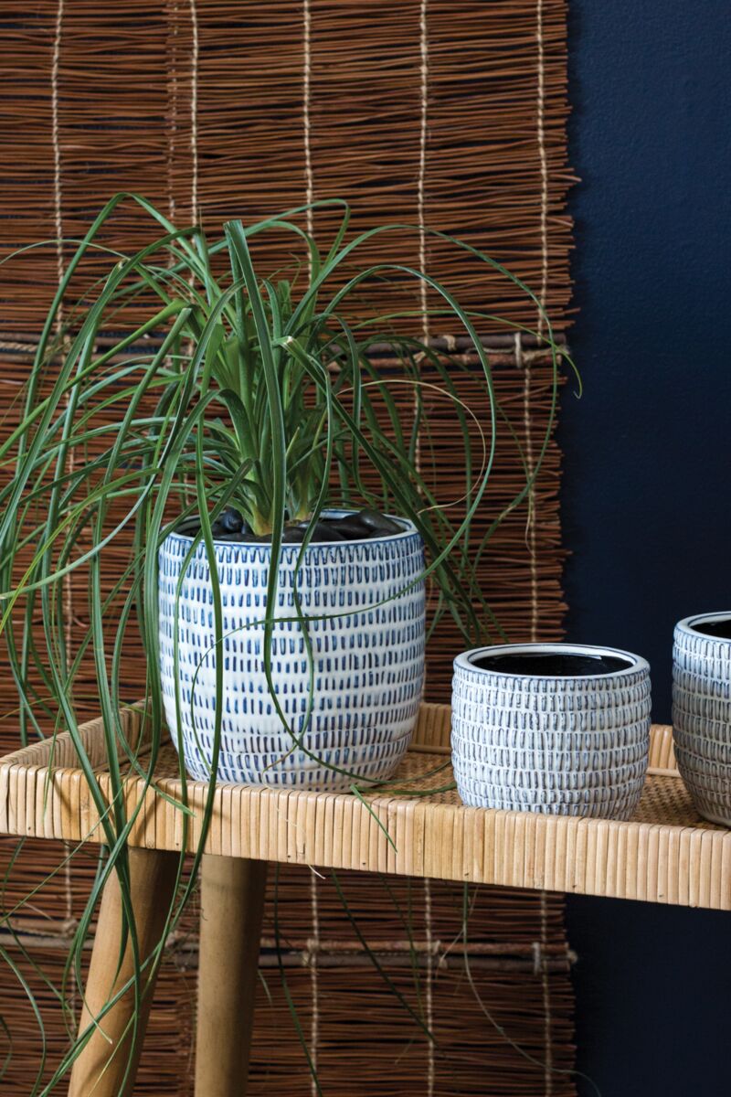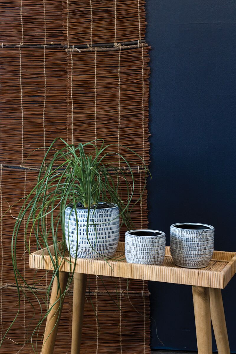 The simple ceramic Jupiter Pot is made by hand and features a unique patterned textured design and white glaze.