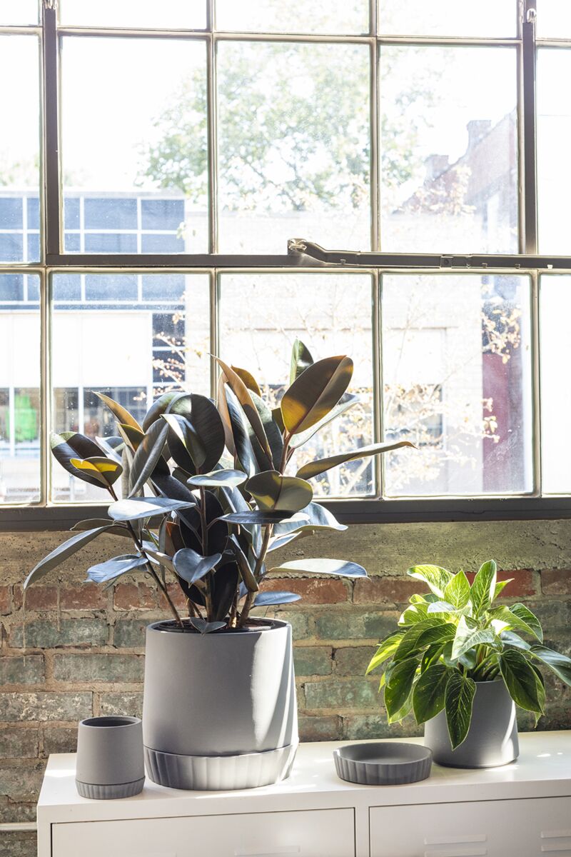 The Kadin Pot comes in a modern matte gray or terra-cotta finish, features a trapezoid shaped pot with drainage hole and a slim saucer, making it the perfect statement piece suitable for indoor or outdoor use.